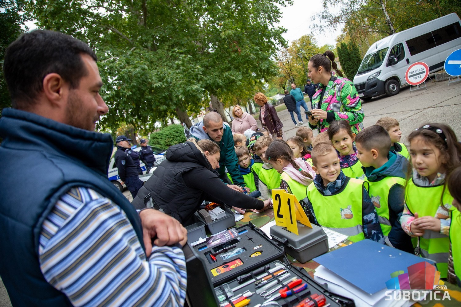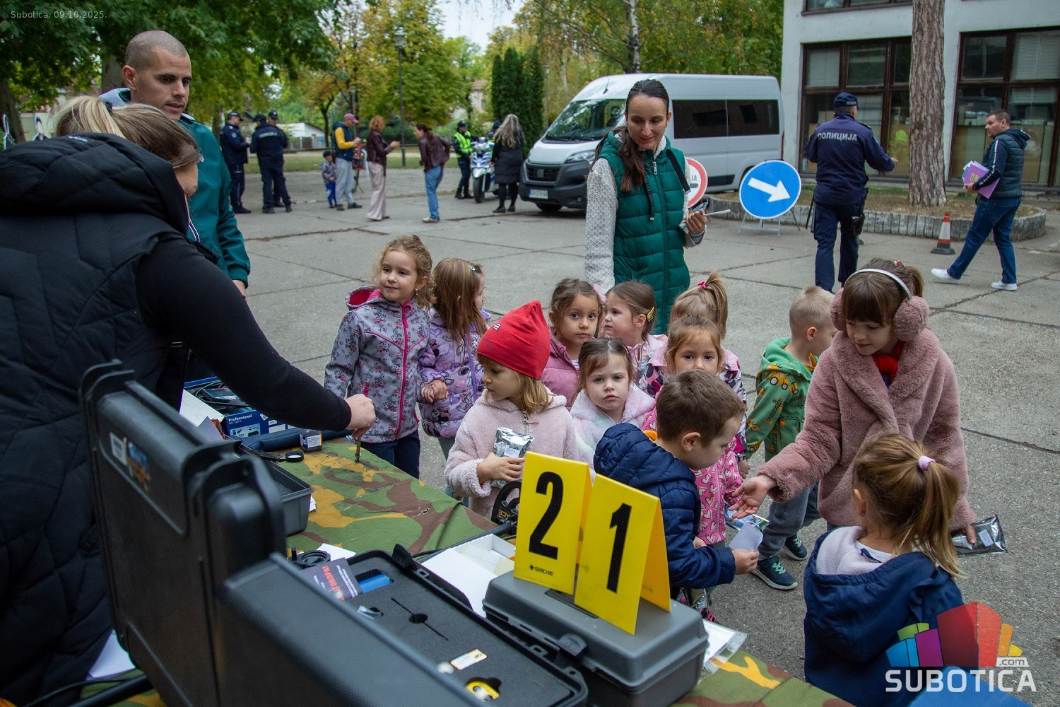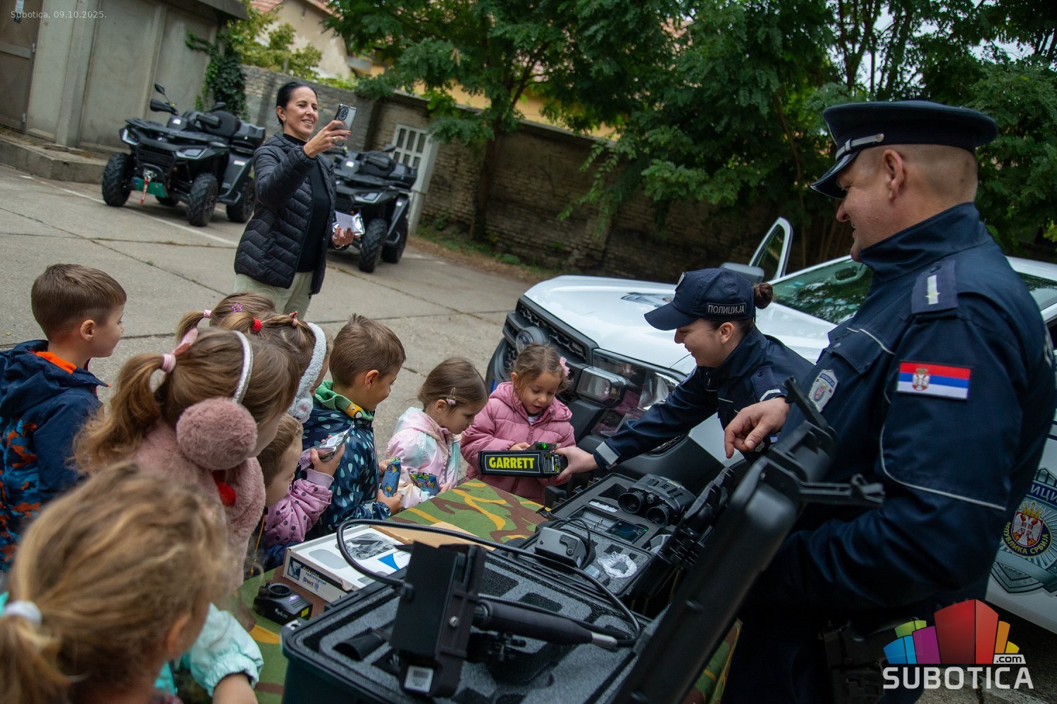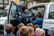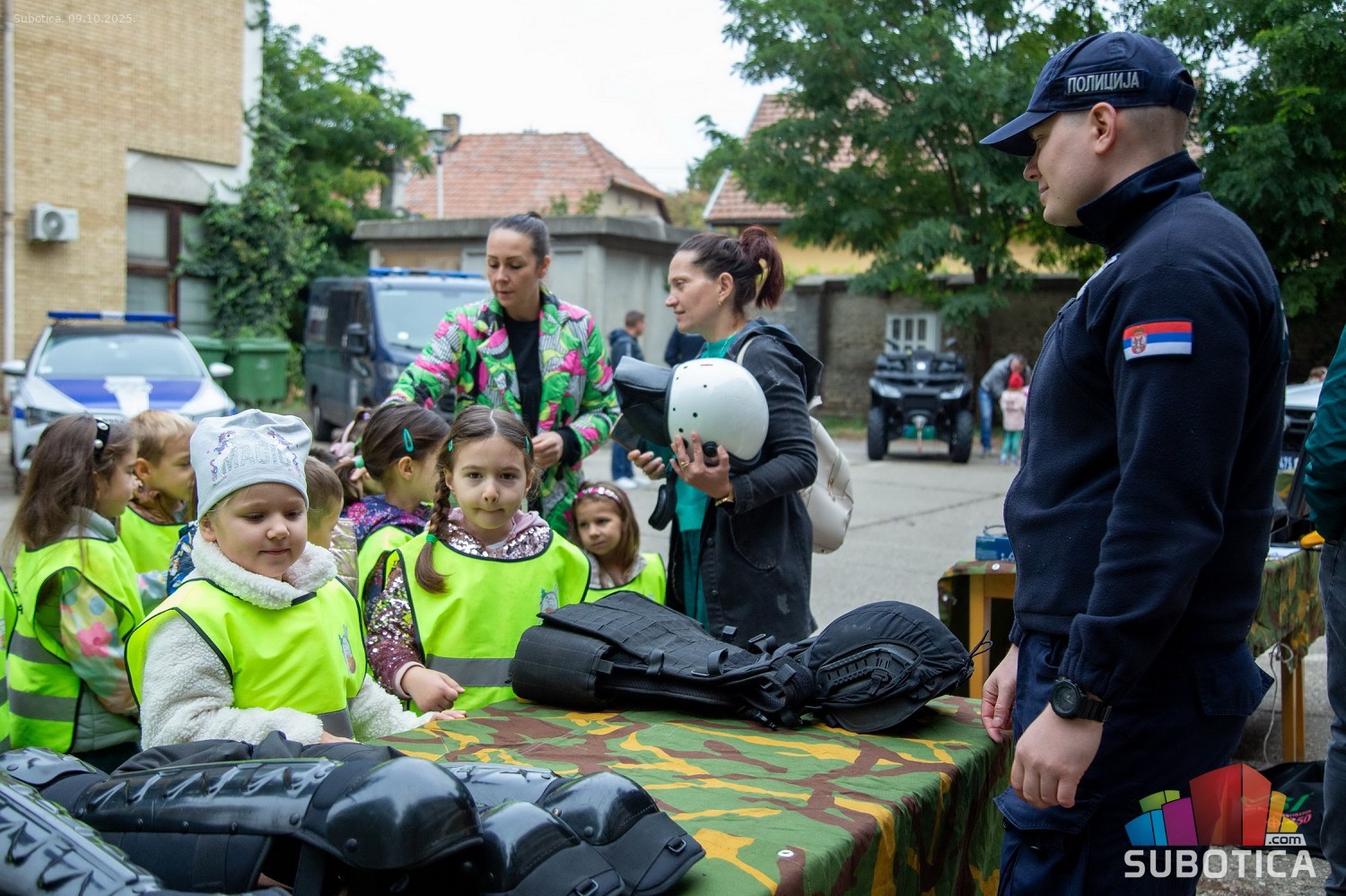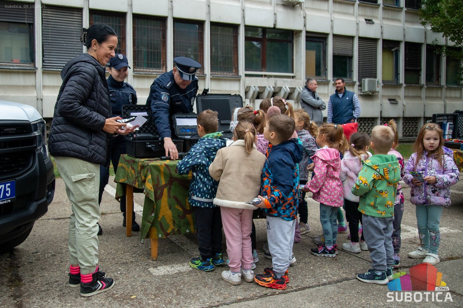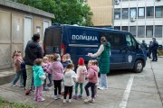 Prikaz tehničko-taktičke policijske opreme i službenih vozila deci predškoskih ustanova (plato ispred Policijske uprave Subotica na Segedinskom putu)