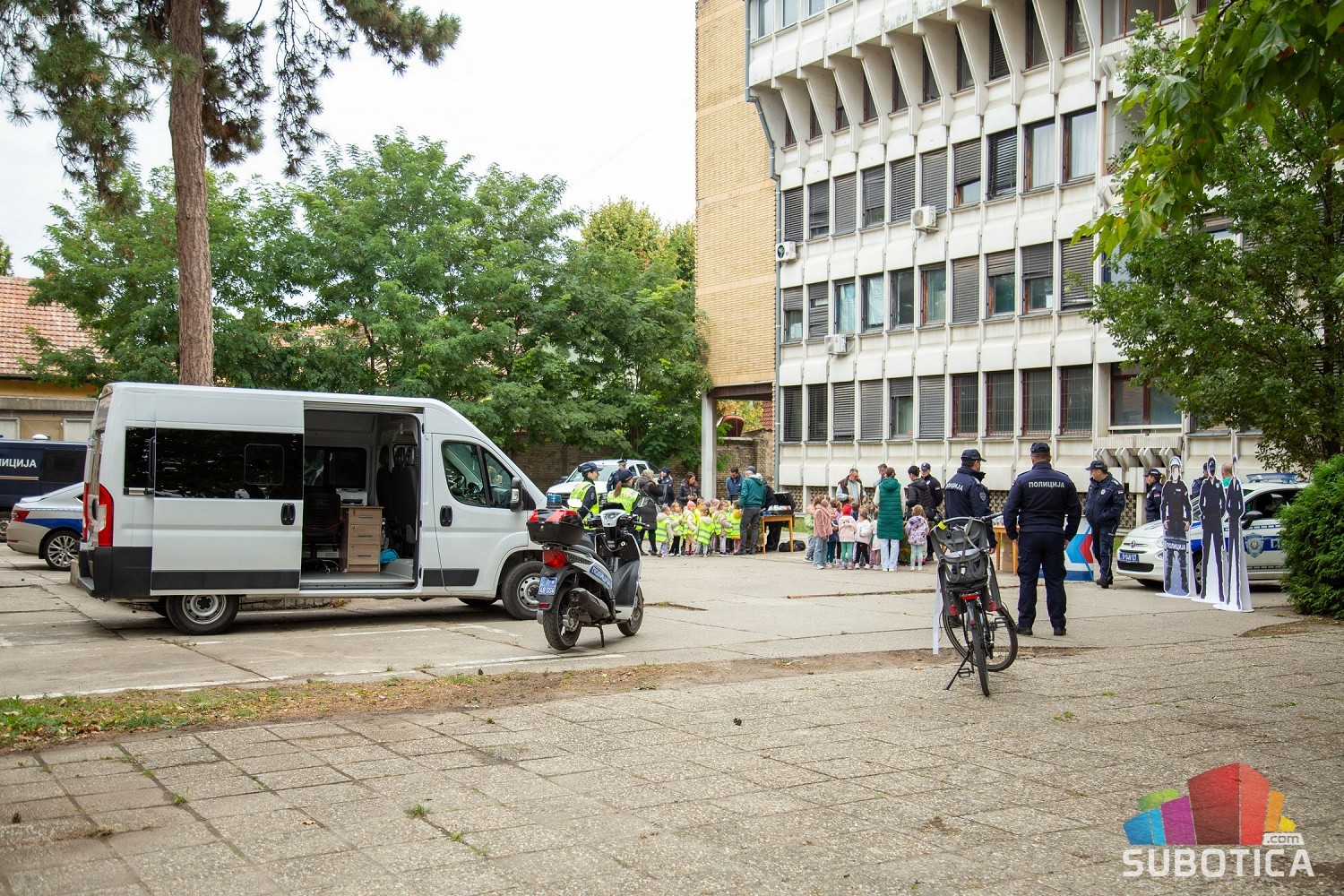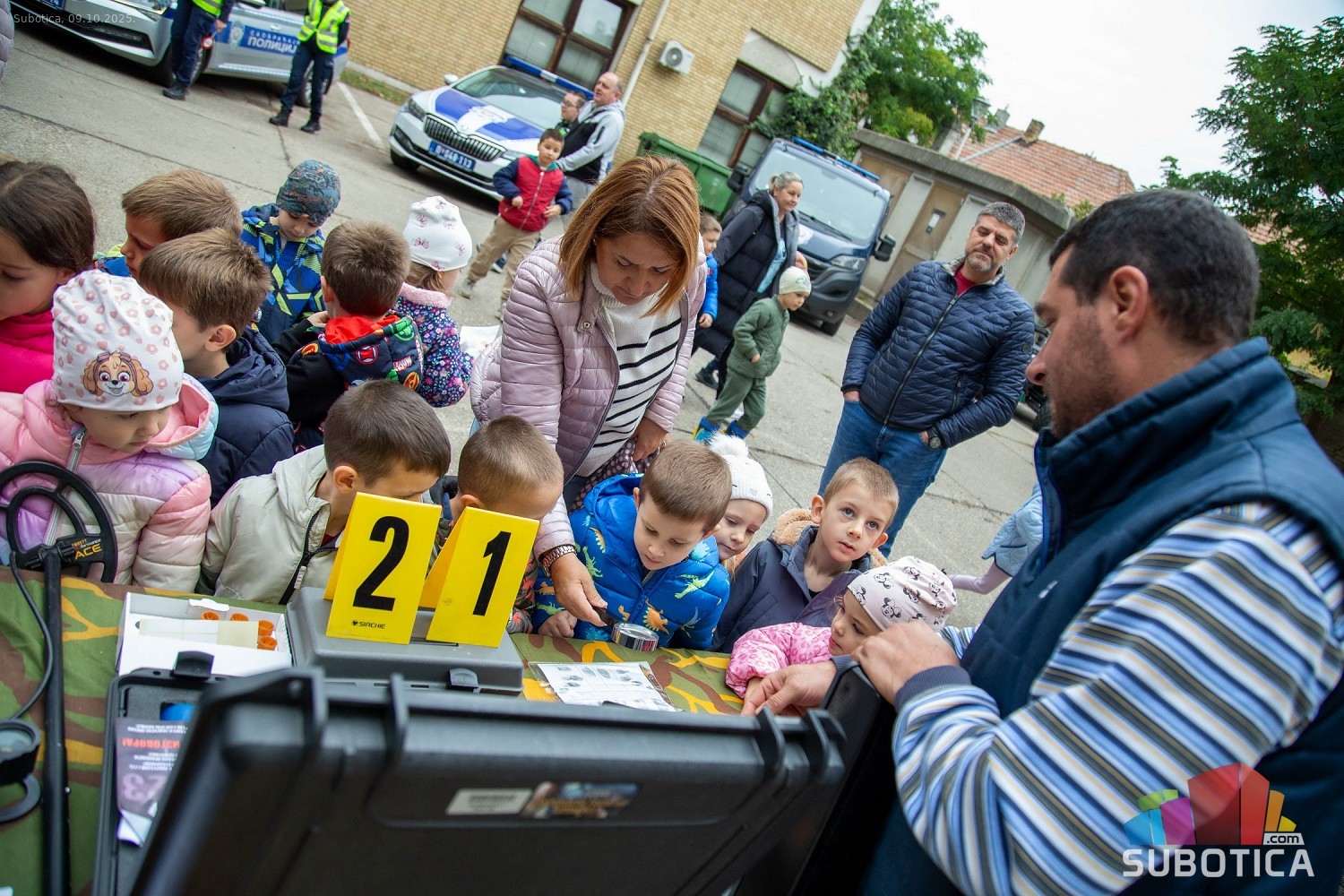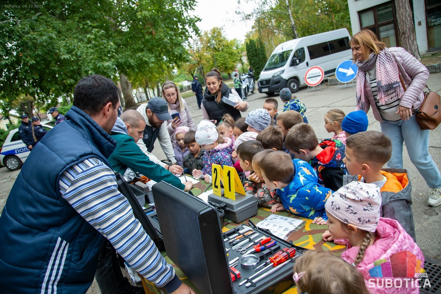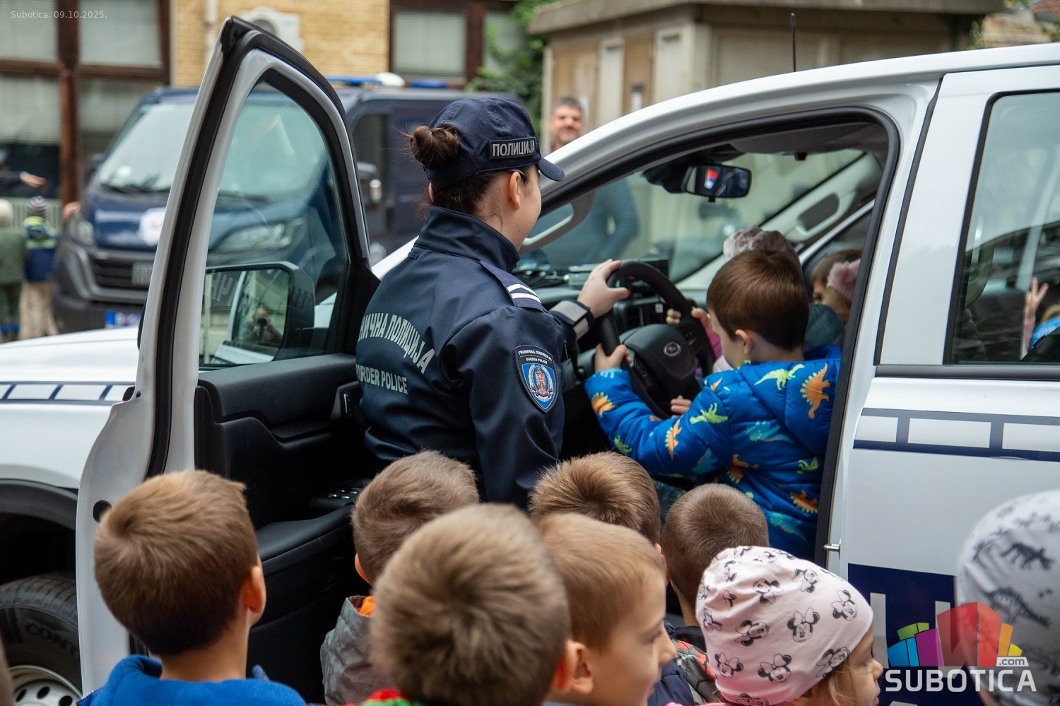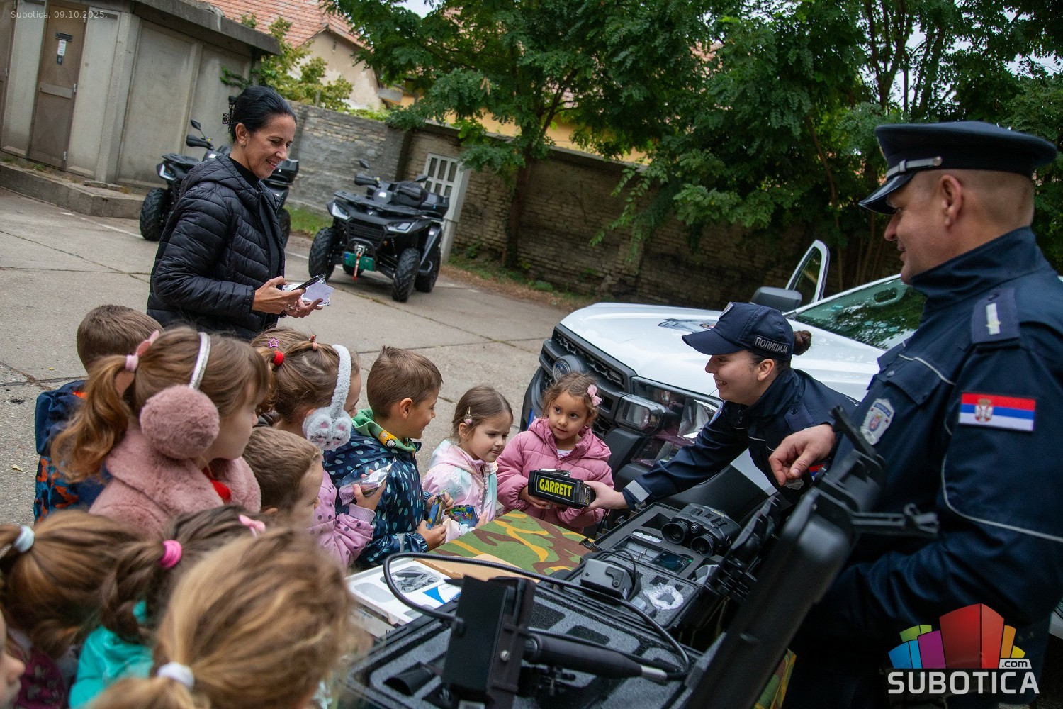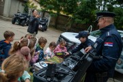 Prikaz tehničko-taktičke policijske opreme i službenih vozila deci predškoskih ustanova (plato ispred Policijske uprave Subotica na Segedinskom putu)