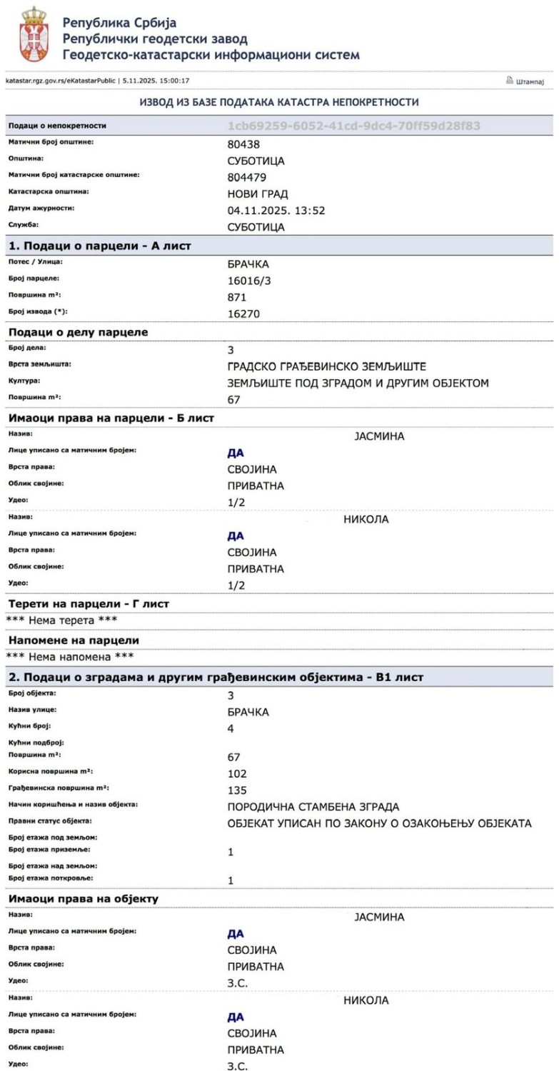 Na prodaju kompletno nameštena porodična kuća, Subotica (početak Bračke ulice) Na odličnoj lokaciji, svega 30 m od asfalta (ul. Jovana Mikića), prodaje se kvalitetno građena i kompletno renovirana kuća, idealna za miran porodični život, ali i kao dugoročna investicija s’ obzirom na gradska infrastrukturna ulaganja u ovaj deo grada. Lokacija - 3 km od centra grada (3–4 min vožnje) - Autobuske linije 8 i 8A, stajalište na oko 100 m - Miran i prijatan komšiluk Površina i raspored - 135 m² stambenog prostora - Prizemlje: 67,5 m² - Sprat (potkrovlje): 67,5 m² - - 57 m² pomoćnih prostorija (garaža, radionica, letnja kuhinja) - Sprat je izuzetno prostran i postoji mogućnost pregrađivanja u dve zasebne prostorije - Drvena terasa na spratu Gradnja i renoviranje - Građena 1980-ih od opeke i blokova - Kompletno renovirana 2022/23. godine - Kompletna termoizolacija (stiropor 10 cm) - Nova fasada od listela biber-crepa - Krov pregledan i pretrešen tokom renoviranja Stolarija - 4 dupla drvena prozora u odličnom stanju - PVC ulazna vrata - PVC prozor i balkonska vrata - Drvena sobna vrata Grejanje i instalacije - Grejanje na struju – 2 GREE inverter klime - AlfaPlam smederevac u kuhinji - Monofazna struja - CATV i IPTV Voda i infrastruktura - Dva funkcionalna bušena bunara - Plitak bunar za kuću (bušen 2022, bez gvožđa) - Dublji bunar za dvorište i letnju kuhinju - - Septička jama sa lakim pristupom sa ulice - U ulici postoje gas i vodovod - Dati potpisi za asfalt – očekuje se ove godine. Plac i dvorište - Pravougaoni plac površine 870 m² - Plac kompletno ograđen - Nadstrešnica za veći automobil - Garaža sa kanalom (cca 3 × 3 × 1,9 m) - Natkrivena terasa - Betonska ploča za montažni bazen ili letnjikovac u zadnjem delu dvorišta Pravna dokumentacija - Uknjiženo 1/1 - Vlasnik - Moguća kupovina putem kredita Cena: 119.990 € ZAMENA Moguća zamena za renoviran stan, minimum veći dvosoban (60+ m²) Prozivka ili Radijalac Kupovina direktno od vlasnika - bez posrednika.