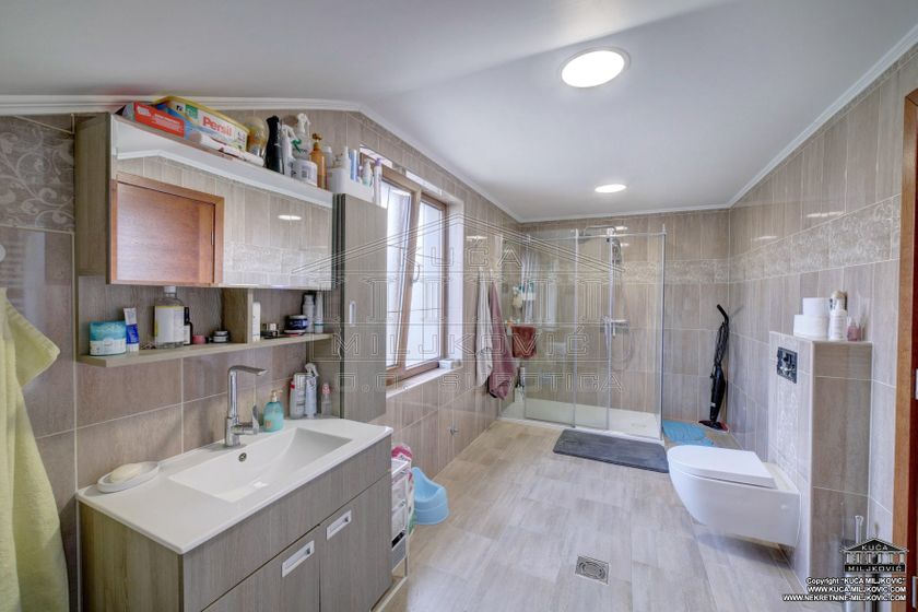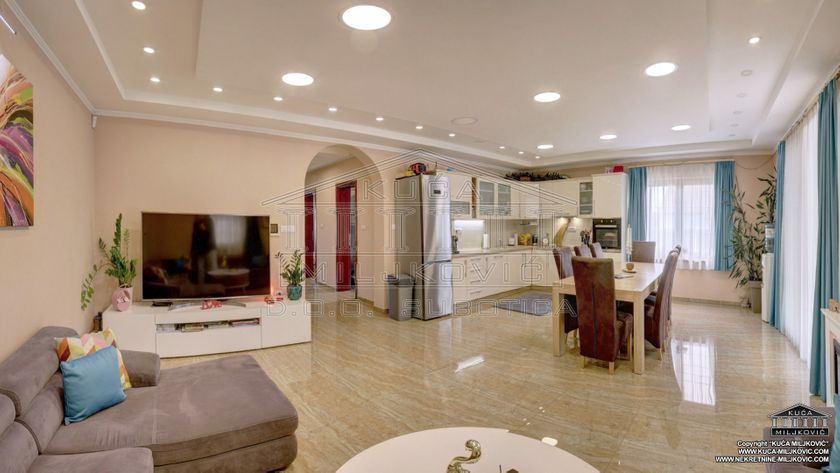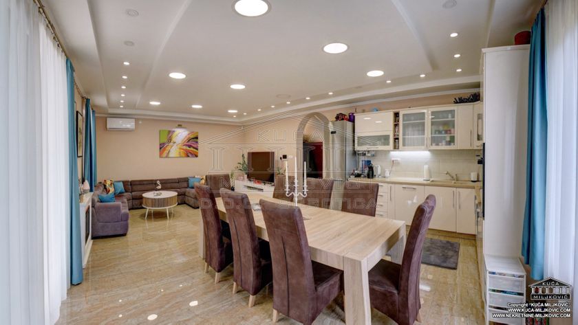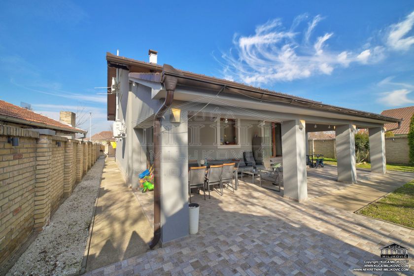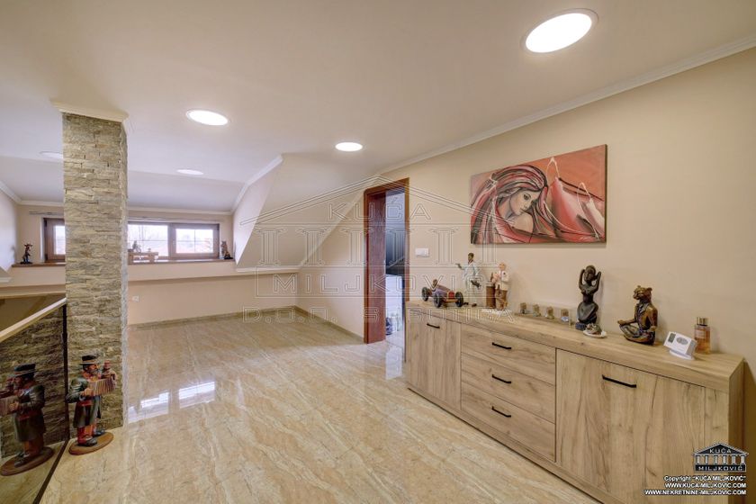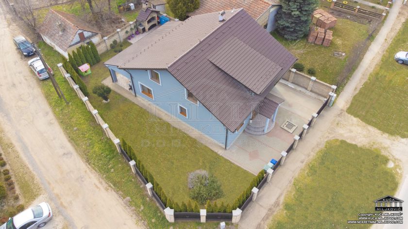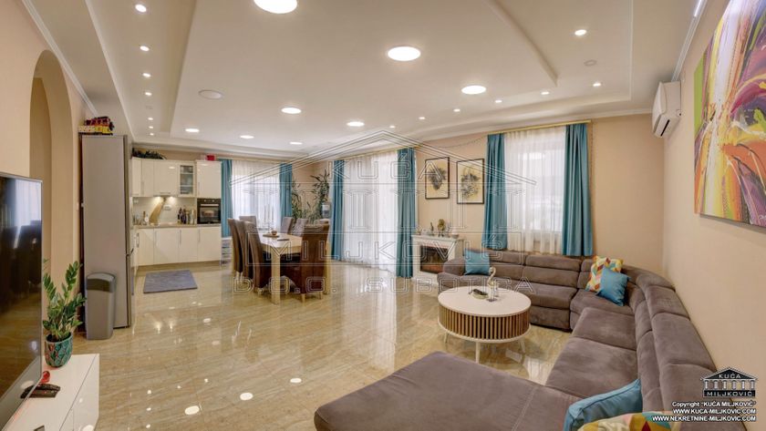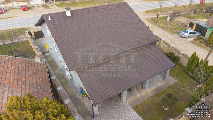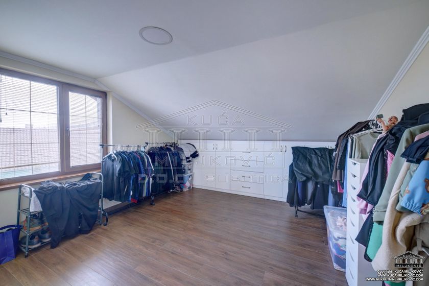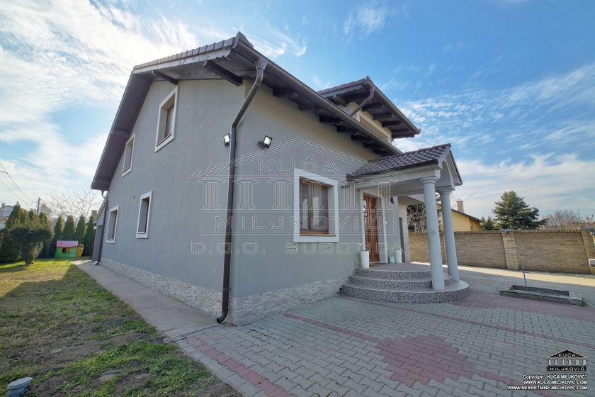 **\-Samostalna spratna, 5-sobna luksuzna novoizgrađena kuća,** korisne površine **246m²,** nalazi se **na samostalnom ograđenom** placu površine **624m²** u **asfaltiranoj** ulici u **Železničkom Naselju u Subotici.** Uz navedenu ponudu postoji mogućnost kupovine još **dva susedna placa** u vlasništvu prodavca kuće, jedan plac je pored kuće, površine **508m²,** a drugi je iza kuće, površine **385m²,** koji bi zajedno sa parcelom na kojoj je kuća, činili **celinu površine 1.517m².** **\-U prizemnom delu kuće se nalaze:** dnevni boravak sa kuhinjom i trpezarijom, spavaća soba, kupatilo sa velikom hidromasažnom tuš-kabinom, velika natkrivena dvorišna terasa, garaža za jedan automobil, kotlarnica i hodnik. **\-U potkrovlju su:** veliko predsoblje, kupatilo i 3 zasebne sobe, od kojih je jedna u funkciji spavaće sobe, druga je soba za zabavu a treća je garderober. **\-Termo izolacija** je izvedena sa spoljašnjim sendvič zidovima (cigla-termo izolacija-cigla). **\-Stolarija** je **kvalitetan PVC** u boji zlatnog hrasta. **\-Unutrašnja stolarija** - visoko kvalitetna. **\-Grejanje** u kući je podno na **gas, čak i u garaži.** \-Povezana je **na gradsku vodu i kanalizaciju.** **\-Kuća je uredno uknjižena u katastru u punom gabaritu sa svim etažama, na vlasnika 1/1, sa upisanim teretom hipoteke banke.** **\-Moguće plaćanje za gotovinu ili stambeni kredit.** U slučaju plaćanja gotovinom, hipoteka će biti obrisana. U slučaju kupovine na stambeni kredit, hipoteka će biti modifikovana da glasi na novog vlasnika i banku putem koje je realizovao stambeni kredit.