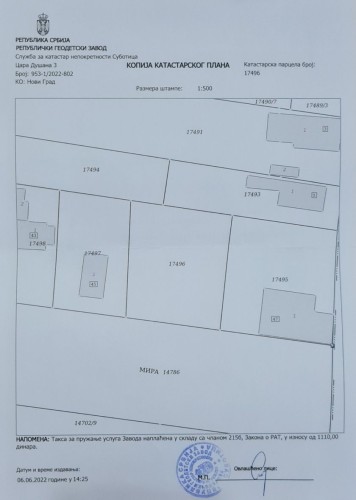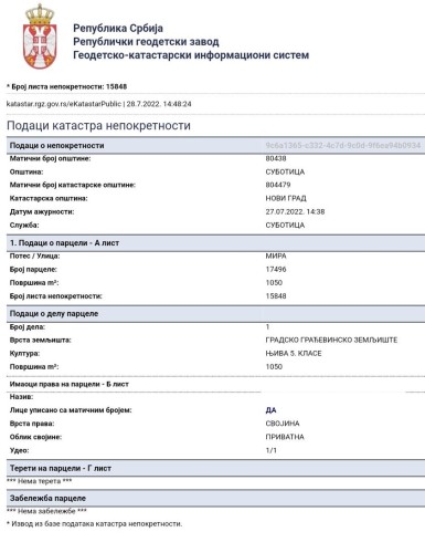 Glavni put E-5 Subotica-Palić. Predmet prodaje je građevinsko zemljište uknjiženo kao privatna svojina vlasnika 1/1, površine 1.050 m2, ulični front 30m x 35m. Br parcele: 17496, K.O. Radanovac. Ulica: Mira br 47. Podaci o građevinskom zemljištu: Koeficijent zauzetosti parcele 40%. Koeficijent izgradnje 1, maksimalna kvadratura budućeg objekta do 1.200 m2. →Dozvoljeno građenje sledećih objekata: Poslovni ili poslovno - stanbeni ili stanbeni objekat Poslovni objekat (može se graditi kao jedinstveni objekat na parceli ili kao zaseban objekat na parceli sa porodičnim stanbenim objektom) Drugi objekti na parceli (pomoćni) →Dozvoljena spratnost objekta: P+1+PK (+podrum ili suteren) → Namena poslovnih, stambeno-poslovnih i porodičnih stambenih objekata: Podrum - za pomoćne, prateće eventualno radne prostorije (proizvodnja, radionica, kotlarnica, prostor za smeštaj ogreva, ostava, sklonište, garaža i sl.). Suteren — za pomoćne i radne prostorije (proizvodnja, radionica, kotlarnica, smeštaj ogreva, ostava, garaža i sl.). Prizemlje – za stambene ili poslovne prostorije (ulazni holovi, recepcije, trgovinsko ugostiteljski sadržaji, prodavnice, zabavni saloni, komercijalni sadržaji, zanatske radnje, proizvodnja, radionica) Visoko prizemlje - za stambene ili poslovne prostorije (ulazni holovi, recepcije, smeštajni kapaciteti, trgovinsko ugostiteljski sadržaji, prodavnice, zabavni saloni, komercijalni sadržaji, zanatske radnje, proizvodnja, radionica) Sprat - za stambene i za poslovne prostorije za određenu vrstu delatnosti (sobe za izdavanje u funkciji turizma, pansioni, poslovna predstavništva, proizvodnja, radionica i sl.) Potkrovlje i mansarda za stambene i za poslovne prostorije za određenu vrstu delatnosti (sobe za izdavanje u funkciji turizma, pansioni, poslovna predstavništva, proizvodnja, radionica i sl.) → Dozvoljene delatnosti: službeni servisi (benzinske stanice, gasne stanice, praonice vozila, i sl.) ugostiteljstva (motel, pansion, restoran, taverna, kafe bar, picerija, hamburgerija...) trgovine (prodavnice svih tipova za prodaju prehrambene i široke potrošnje na malo, autoplacevi i dr.), poslovno-administrativnih poslova predstavništva, filijale banaka, pošte, agencije, poslovni biroi ), poljoprivrede (poljoprivredna apoteka, veterinarska stanica i sl.), uslužnog zanatstva (pekarske, poslastičarske, obućarske, krojačke, frizerske, fotografske radnje, praonice vozila i druge zanatske radnje), uslužnih delatnosti (proizvodnja, radionica, knjižara, videoteka, hemijska čistiona i dr.), zdravlja (apoteka, opšte i specijalističke ordinacije, ambulante, stacionari manjih kapaciteta i sl.), socijalne zaštite (servisi za čuvanje dece, vrtići, obdaništa, igraonice za decu, smeštaj i nega starih i iznemoglih lica i dr.), kulture (galerije, biblioteke, čitaonice, bioskopske i pozorišne sale i dr.). zabave (kladionice, bilijar saloni, saloni video igara i dr.), sporta (sportski tereni, teretane, vežbaone za aerobik, fitnes, bodibilding i dr.). Ispred placa nalazi se sva infrastruktura, struja, voda, kanalizacija, gas, telefonski linija, optički internet, a na placu postoji bušeni bunar sa hidropakom. Cena 155.000 eura.