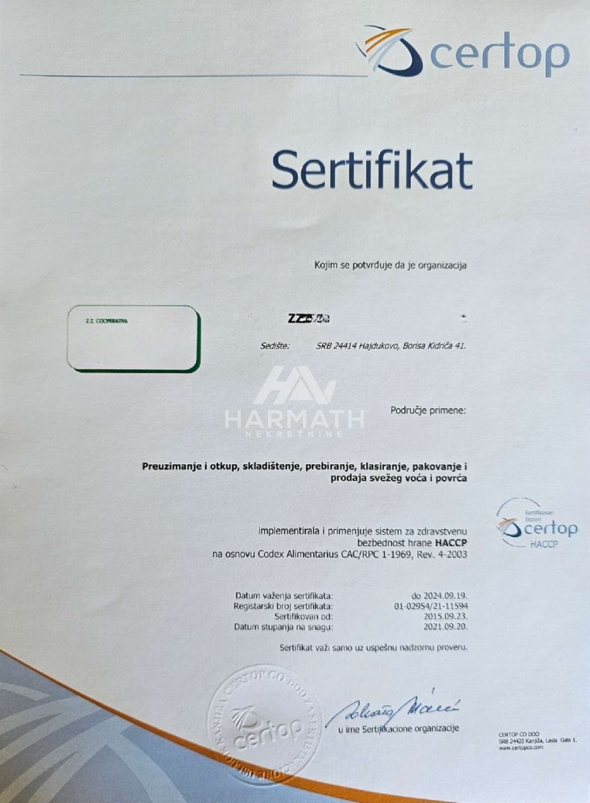 Prodaje se poslovni objekat koji se trenutno koristi kao ULO hladnjača. Površina objekta iznosi 1659m2, nalazi se na zemljištu površine 7159m2 sa velikim uličnim frontom koji gleda na glavnu put i ima obezbedjen teretni prilaz iz dve ulice. Konstrukcija objekta je od čeličnih panela, dok je temelj projektovan i izveden u skladu sa potrebama obavljanja industrijske delatnosti. Poslovni objekat poseduje zasebnu trafo stanicu kapaciteta 250kWa. Osim toga postoje bušeni bunar i hidrant. Sve je urađeno po HACCP standardu o čemu postoji sertifikat. Kapacitet hladnjače iznosi 150 vagona. Kompleks se nalazi na 2 km od autoputa, 19km od graničnog prelaza Horgoš, 15km od grada Subotica Video: youtu.be/3Vq3sLVCUNM?si=SFFeHXnhuVbRmk0l Za više informacija posetite naš sajt preko sledećeg linka: harmathnekretnine.rs/detalji-nekretnine/127 ili pozovite na označeni kontakt telefon.