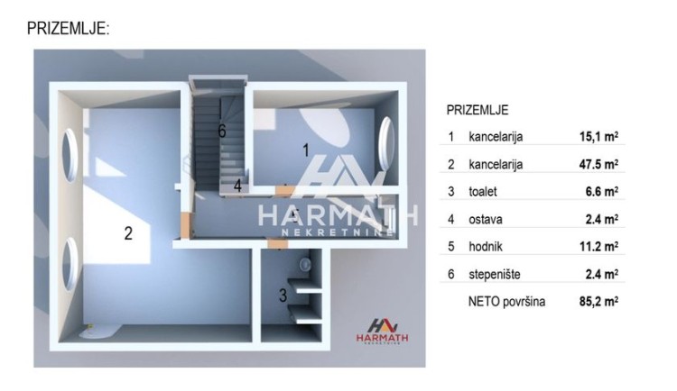 Prodaju se prizemlje i potkrovlje u poslovnoj zgradi, smeštenoj u centru grada, preko puta Sarićevog spomenika. Prizemlje: 85,2 m² Potkrovlje: 137,3 m² Što čini ukupnu površinu: 222,5 m² Cena: 190.000,00 EUR Prostor ima toalet i poseban ulaz. Idealno je za kancelarije, trgovinu, uslužne delatnosti ili druge poslovne svrhe. Za više informacija posetite naš sajt: harmathnekretnine.rs/detalji-nekretnine/342 ili nas kontaktirajte na označeni telefon 064/282-9425