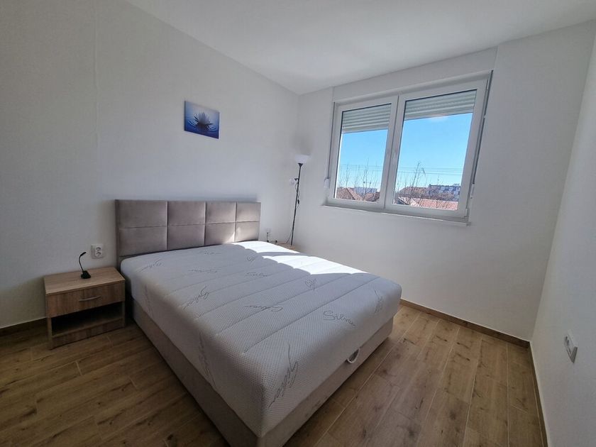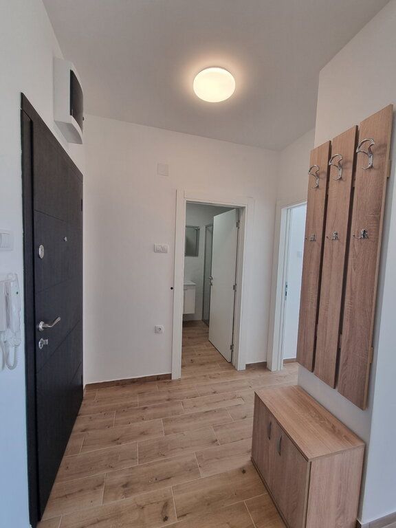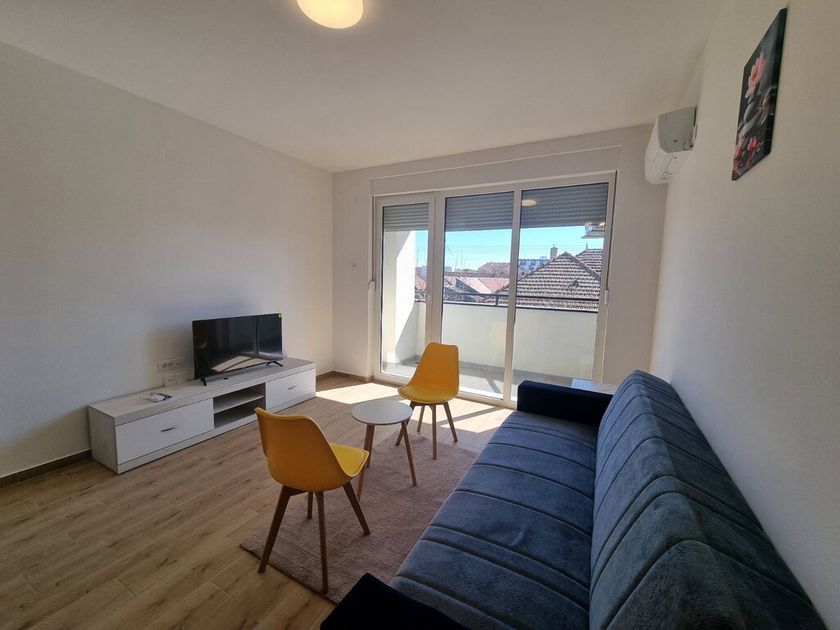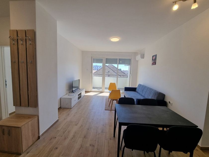Dvosoban stan od 51m2 u novosagrađenoj zgradi sa liftom na 1/5 spratu. Sastoje sa od velikog dnevnog boravka sa trpezarijom i kuhinjom koji vodi na terasu, spavaće sobe i kupatila sa tuš kabinom. Na podovima je tarket prozori su PVC, a grejanje je na gas. Stan je opremljen novim nameštajem, uređajima, priborm. Stan ima obezbeđeno parkig mesto u dvorištu zgrade. Obavezan depozit u visini jedne kirije, minimalni najam 6 meseci za nepušače , bez kućnih ljubimaca.
