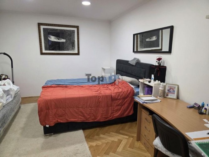 Četvorosoban salonski stan, 196 m2, na prvom spratu kod mlečne pijace koncipiran kao jedna celina koja se sastoji od dva stana trosobnog i jednosobnog. Grejanje je na gas, parketiran i ima dva kupatila. Stanu pripada i deo prelepog dvorišta površine oko 500 m2.