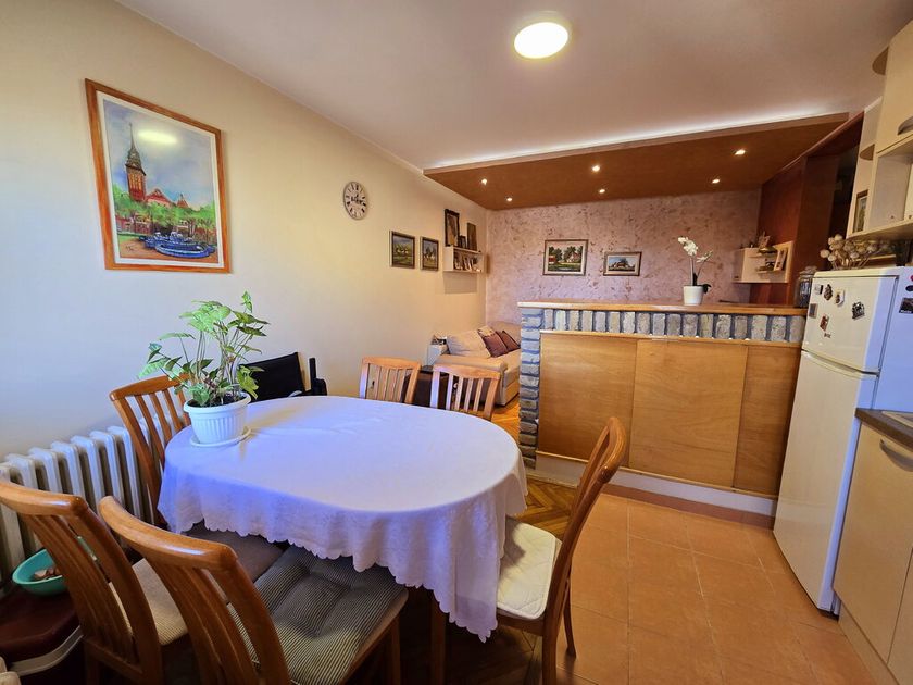 U mirnom delu Radijalca na odličnoj lokaciji prodaje se kompletno namešten stan na 7/7 spratu u zgradi sa liftom. Površine je 58m2 sa odličnim rasporedom prostorija raspoređenih u dve spavaće sobe, kupatila i dnevnog boravka sa kuhinjom, trpezarijom i terasom. Na podovima je keramika i parket, prozori su PVC a grejanje je gradsko. Stanu pripada podrumska prostorija.