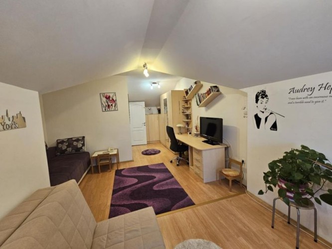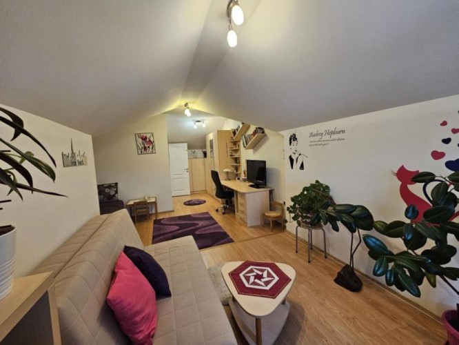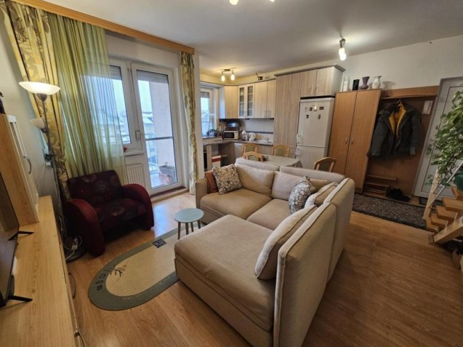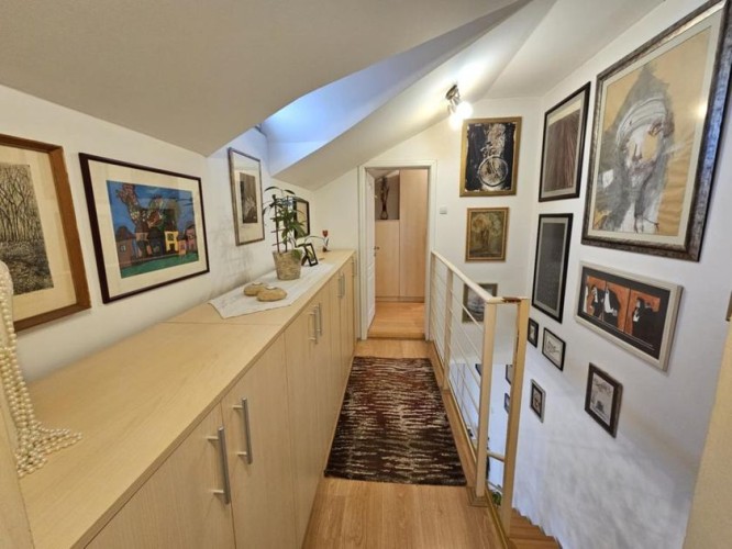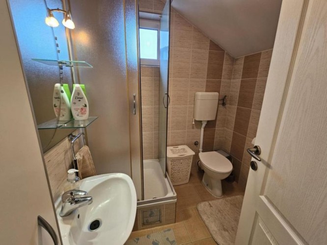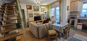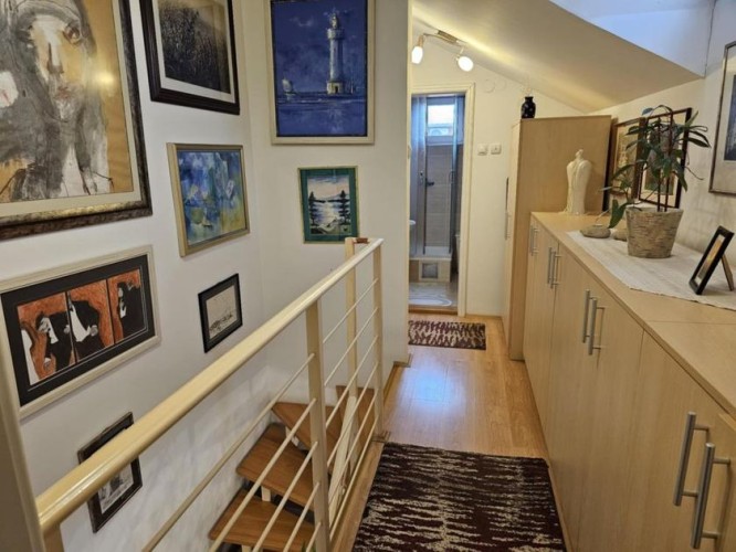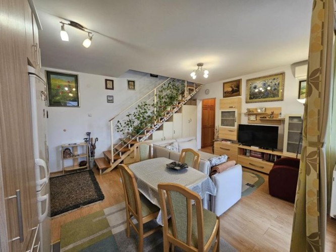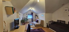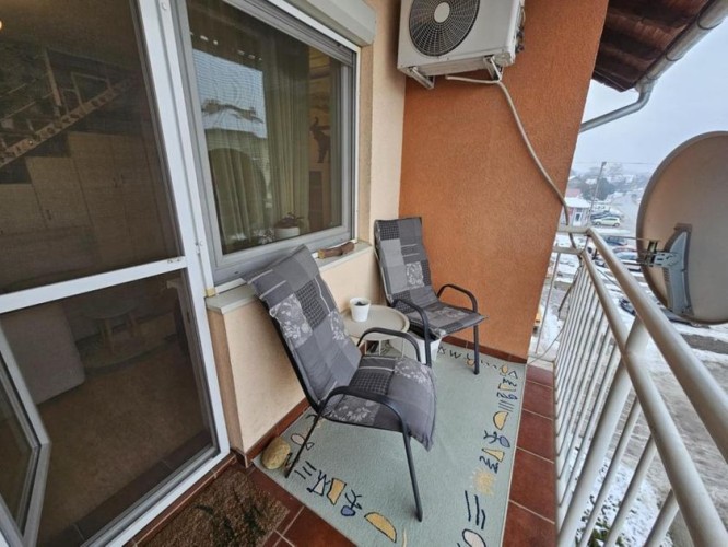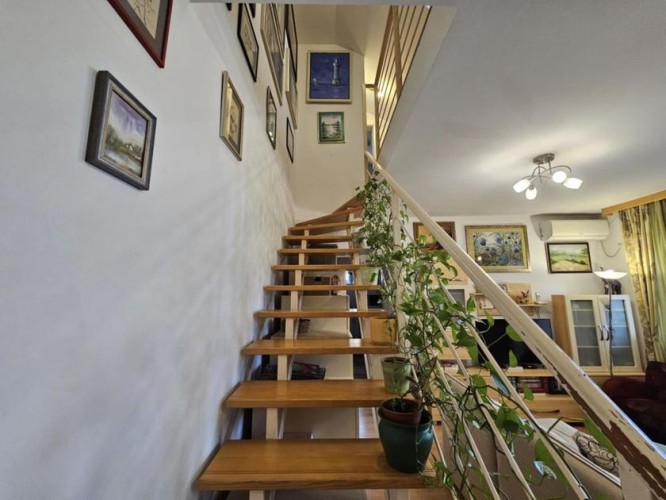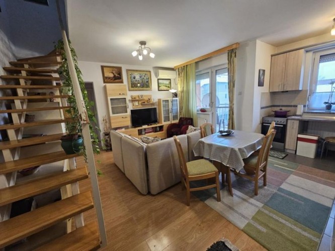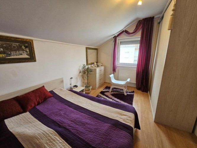 Prodaje se lep četvorosoban stan na drugom spratu sa nameštajem i zidanom garažom u istoj zgradi . Stan je dupleks i ima izuzetno dobar raspored . Na drugom spratu se nalazi dnevni boravak sa kuhinjom - trpezarijom , kupatilo sa kadom , jedna spvaća soba i terasa ( ukupno 47,1 kvm ) . U potkrovlju se nalaze dve velike i prostrane spavaće sobe , hodnik i veliko kupatilo sa tuš kabinom ( ukupno 45 kvm ). Stan je ekonomičan , ima niske režijske troškove i pedantno je očuvan . Opremljen stan poseduje : grejanje na gas sa radijatorima ( ima sopstvenu mernu jedinicu ), kvalitetne PVC prozore sa roletnama i komarnicima , klima uređaj , telefon , internet , kablovsku , nameštaj koji je izrađen po potrebi i praktično ispunjuje korisne površine . Zgrada je kvalitetna , čista , tiha , uredna i lepo održavana. Blizu je škola , obdanište , jaslice ,tržni centar , autobus i centar grada. Ima urednu dokumentaciju , nema tereta , može stambeni kredit.