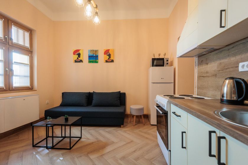 Jednoiposoban stan,potpuno renoviran,salonskog tipa,visoki plafoni,nov namestaj i tehnika. Sastoji se od predsoblja,dnevnog boravka sa kuhinjom i trpezarijskim delom koje cine jednu prostoriju,hodnika sa garderobnim ormanom, kupatila i posebno odvojenom spavacom sobom.U kupatilu je kombinovana masina za pranje i susenje vesa. Funkcionalan za jednu osobu ili par.Trosed u dnevnom boravku moze da se razvuce za spavanje ukoliko Vam dodju gosti. Grejanje i hladjenje je reseno putem toplotne pumpe i fancoil uredjaja,tako je tokom cele godine moguce stvoriti idealnu temperaturu uz minimalne rezijske troskove.Van sezone grejanja i hladjenja oko 3000 din,u sezoni zavisi od spoljasnjih temperatura... Televizor su smart i imaju program besplatnih digitalnih kanala: RTS1, RTS2, Pink, O2.TV, Prva, Happy, RTV1, RTV2, RTS3, Info kanal, TV Most, TV YU ECO, TV Panon, Radio Beograd 1, Radio Beograd 2, Beograd 202 Postoji ogradjen zatvoren dvorisni prostor gde mogu da se smeste bicikl ili skuter,parkiranje automobila je na ulici i ne placa se tj.nije u zoni naplate parkinga. Nalazi se centru grada u ulici Nikole Kujundzica,na uglu sa Preradovicevom ulicom,u blizini velike Katedrale i bioskopa Lifka. Opremljen je u potpunosti,posteljina,peskiri kuhinjsko posudje,escajg... Frizider sa zamrzivacem,mikrotalasna,sporet sa 4 ringle i rernom,kuvalo za vodu... Pusenje i kucni ljubimci nisu dozvoljeni. Cena je 250e mesecno uz depozit u visini jednog zakupa. Za zakup na duzi vremenski period moguc dogovor oko cene mesecnog zakupa.