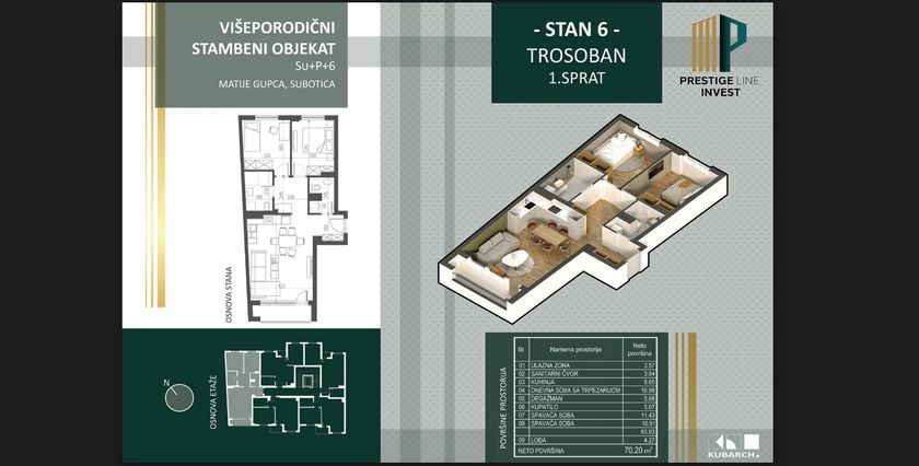 Subotica, Prozivka, na atraktivnoj lokaciji, prodaje se stan u izgradnji u višeporodičnom stambenom objektu Su+P+6. stan se nalazi u prizemlju². površine 46,68 Grejanje u svim stanovima će biti podno na gas, zatim imaće PVC stolariju sa roletnama, na podovima će se nalaziti Tarkett parket i keramika, te će svaki stan imati sigurnosna vrata i klimu. Zgrada se gradi od termobloka+demit fasada i posedovaće lift. Rok završetka izgradnje je predviđen za april 2026. godine. Cena po m² iznosi 1.650 evra sa PDV-om.