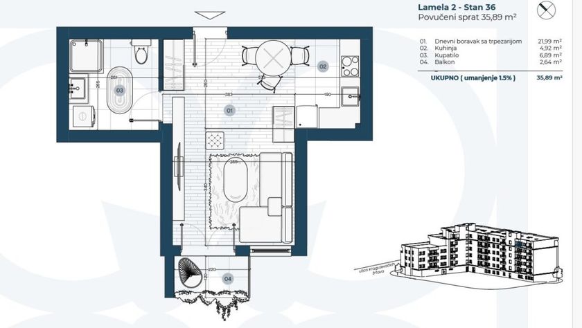 Subotica – Radijalac, prodaje se jednosoban stan u izgradnji površine 35.89kvm koji se nalazi na petom spratu u zgradi sa liftom. Stan u svom sastavu poseduje: sobu sa trpezarijom, kuhinju, kupatilo i balkon. U stanovima se postavljaju izuzetne italijanske pločice, Spačva hrastov parket, Bosal sigurnosna ulazna vrata, sanitarije visokog kvaliteta, klima, Rehau pvc prozori i Pierre smart ready sistem pametne zgrade. Grejanje je na gas, tfs. Objekat će imati najkvalitetniji švajcarski Schindler lift i energetski pasoš B kategorije. Ispod celog objekta nalazi se podzemna garaža sa 60 parking mesta (mogućnost dodatne kupovine). Zgrada će posedovati svoje uređeno zeleno dvorište. Odlična lokacija, na 100m od Dudove šume i Hale sportova. Rok završetka radova je Mart 2027. godine. Cena je 1500e/kvm plus PDV. Red. br. 25-S51