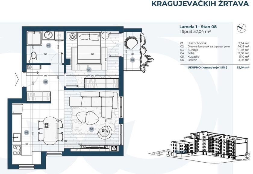 Subotica – Radijalac, prodaje se dvosoban stan u izgradnji površine 52.04kvm koji se nalazi na prvom spratu u zgradi sa liftom. Stan u svom sastavu poseduje: spavaću sobu, dnevnu sobu, kuhinju sa trpezarijom, hodnik, kupatilo i balkon. U stanovima se postavljaju izuzetne italijanske pločice, Spačva hrastov parket, Bosal sigurnosna ulazna vrata, sanitarije visokog kvaliteta, klima, Rehau pvc prozori i Pierre smart ready sistem pametne zgrade. Grejanje je na gas, tfs. Objekat će imati najkvalitetniji švajcarski Schindler lift i energetski pasoš B kategorije. Ispod celog objekta nalazi se podzemna garaža sa 60 parking mesta (mogućnost dodatne kupovine). Zgrada će posedovati svoje uređeno zeleno dvorište. Odlična lokacija, na 100m od Dudove šume i Hale sportova. Rok završetka radova je Septembar 2027. godine. Cena je 1670e/kvm sa PDV. Red. br. 26-N19