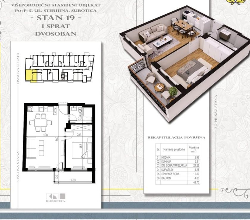 Subotica – Radijalac, prodaje se dvosoban stan u izgradnji površine 49.70kvm koji se nalazi na prvom spratu u zgradi sa liftom. Stan u svom sastavu poseduje: spavaću sobu, dnevnu sobu sa kuhinjom i trpezarijom, kupatilo i terasa. Stolarija je PVC sa roletnama, na podovima je Tarket parket i keramika, sigurnosna ulazna vrata, grejanje je na gas- radijatorima, tfs. Liftovi švajcarskog proizvođača Schindler, nosivost do 630 kg (8 osoba), video nadzor u celom objektu, ograde na terasama su od kovanog gvožđa. Odlična lokacija, u blizini marketa, vrtića, škole i šetališta. Rok završetka radova je Jul 2026. godine. Cena je 1550e/kvm plus PDV. Red. br. 26-N26