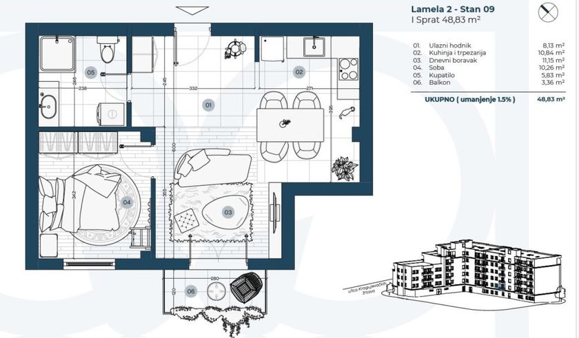 Subotica – Radijalac, prodaje se dvosoban stan u izgradnji površine 48.83kvm koji se nalazi na prvom spratu u zgradi sa liftom. Stan u svom sastavu poseduje: spavaću sobu, dnevnu sobu, kuhinju sa trpezarijom, hodnik, kupatilo i balkon. U stanovima se postavljaju izuzetne italijanske pločice, Spačva hrastov parket, Bosal sigurnosna ulazna vrata, sanitarije visokog kvaliteta, klima, Rehau pvc prozori i Pierre smart ready sistem pametne zgrade. Grejanje je na gas, tfs. Objekat će imati najkvalitetniji švajcarski Schindler lift i energetski pasoš B kategorije. Ispod celog objekta nalazi se podzemna garaža sa 60 parking mesta (mogućnost dodatne kupovine). Zgrada će posedovati svoje uređeno zeleno dvorište. Odlična lokacija, na 100m od Dudove šume i Hale sportova. Rok završetka radova je Mart 2027. godine. Cena je 1500e/kvm plus PDV. Red. br. 25-S49