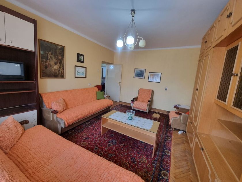 Dvosoban stan od 55 m2 na trećem spratu u zgradi bez lifta. Sastoji se od hodnika iz kojeg se ulazi u spavaću sobu sa zatvorenom terasom, dnevnu sobu, kuhinju sa trpezarijom koja ima izlaz na veliku terasu, ostavu i kupatilo. Na podovima je parket, prozori su drveni, a grejanje je na gradsku toplanu sa alokatorima. Obavezan depozit u visini jedne kirije, minimalni najam 6 meseci za nepušače , bez kućnih ljubimaca.
