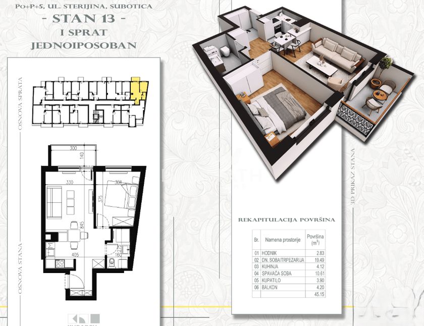 Prodaje se jednoiposoban stan u izgradnji na prvom spratu višeporodičnog stambenog objekta Su+P+5 Dudova šuma. Stan će se nalaziti na atraktivnoj lokaciji u ulici Sterijina br. 33. Karakteristike stana: - Ukupne površine: od 45,15m2 - Raspored prostorija: -Ulazni hodnik -Kupatilo -Kuhinja -Dnevna soba sa trpezarijom -Spavaća soba -Terasa Tehničke karakteristke: -Grejanje: Centralno na gas sa kalorimetrima -Sigurnosna ulazna vrata. -Podovi: Tarkett parket i keramika I klase -Inverter klima uređaji -Prozori i vrata: PVC stolarija sa električnim roletnama i niskoemisionim troslojnim staklima -Zgrada se gradi od klimabloka 25cm+demit fasade sa 10cm fasadnim stiroporom. -Zidovi između stanova i hodnika: klimablok 10cm, zvučna izolacija do 54dB. -Posedovaće lift. Rok završetka izgradnje je predviđen za jul 2026. godine. Cena stana iznosi 65.468,00 evra + 10% PDV Mogućnost kupovine garažnih i parking mesta Lokacija: -U neposrednoj blizini naselja Radijalac, poznatom po svojoj dobroj infrastrukturi, blizini škola, vrtića, prodavnica, šetališta Aleja, Dudova šuma, pijace, marketa, zdravstvenih ustanova i na 5 min od centra grada Blizina: -Samo par minuta hoda do gradskog prevoza, što omogućava laku povezanost sa svim delovima grada. Za više informacija posetite naš sajt preko sledećeg linka: harmathnekretnine.rs/detalji-nekretnine/486 ili pozovite na označeni kontakt telefon.
