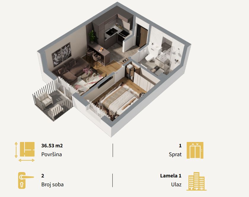 Stan u novogradnji površine 36.53m2 koji se sastoji od dnevnog boravka sa kuhinjom i trpezarijom, kupatla, spavaće sobe i terase.Zgrada je građena od termoblokova najviših izolacijskih svojstava+fasadna izolacija.Pregradni zidovi će biti izgrađeni od opeke. Tarket podne obloge u sobama i trpezariji a u kuhinji I kupatilu I klasa keramike i tuš paravan od kaljenog stakla, linijski slivnik i ugradni vodokotlić. Stan će imati sigurnosna vrata, optički priključak, interfon i instalacije za klimu. Rok završetka poslednji kvarta kvartal 2027.godine.