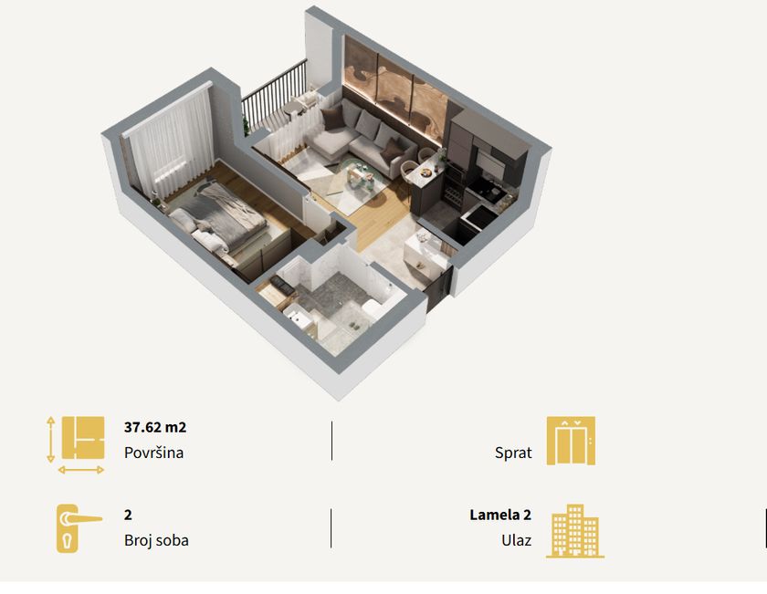 Stan u novogradnji površine 37.62m2 koji se sastoji od dnevnog boravka sa kuhinjom i trpezarijom, kupatla, spavaće sobe i terase.Zgrada je građena od termoblokova najviših izolacijskih svojstava+fasadna izolacija.Pregradni zidovi će biti izgrađeni od opeke. Tarket podne obloge u sobama i trpezariji a u kuhinji I kupatilu I klasa keramike i tuš paravan od kaljenog stakla, linijski slivnik i ugradni vodokotlić. Stan će imati sigurnosna vrata, optički priključak, interfon i instalacije za klimu. Rok završetka poslednji kvarta kvartal 2027.godine.