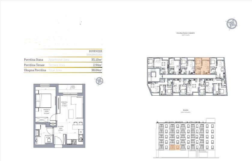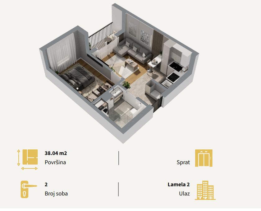 Stan u novogradnji površine 38,04m2 koji se sastoji od dnevnog boravka sa kuhinjom i trpezarijom, kupatla, spavaće sobe i terase.Zgrada je građena od termoblokova najviših izolacijskih svojstava+fasadna izolacija.Pregradni zidovi će biti izgrađeni od opeke. Tarket podne obloge u sobama i trpezariji a u kuhinji I kupatilu I klasa keramike i tuš paravan od kaljenog stakla, linijski slivnik i ugradni vodokotlić. Stan će imati sigurnosna vrata, optički priključak, interfon i instalacije za klimu. Rok završetka poslednji kvarta kvartal 2027.godine.