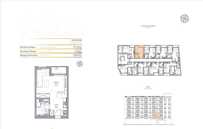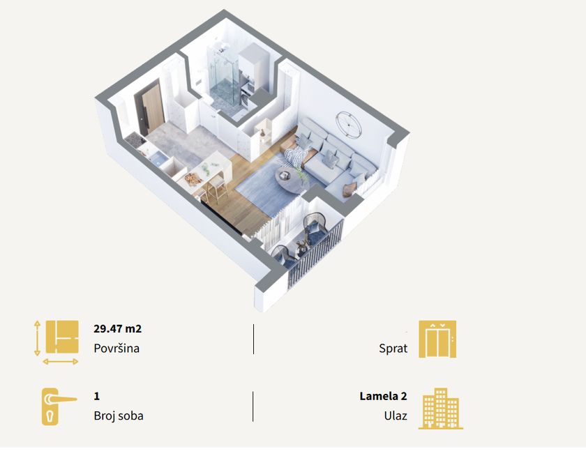 Stan u novogradnji površine 29.47m2 koji se sastoji od dnevnog boravka sa kuhinjom i trpezarijom i kupatila. Stan će imati podno grejanje koje se ističe niskim troškovima grejanja na prirodni gas, kvalitetnu aluminijumsku stolariju sa troslojnim niskoemisionim staklom i PVC roletnom. Zidovi su izgrađeni od termoblokova najviših izolacijskih svojstava + fasadna izolacija.Pregradni zidovi izgrađeni su od opeke. Na podovima će biti tarket podne obloge u sobama i trpezariji, a keramika I klase u kupatilima i kuhinji. U kupatilu tuš paravani od kaljenog stakla i linijski slivnici i ugradni vodokotlići. Stan će imati sigurnosna ulazna vrata,optički priključak,interfon iinstalacije za klimu. Završetak radova kraj 2027. godine.
