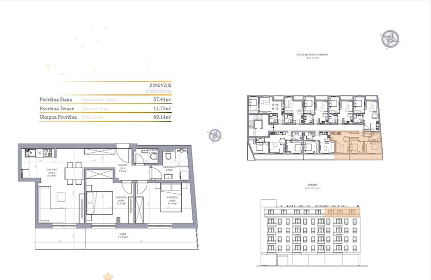 Stan u novogradnji površine 69,14 m2 koji se sastoji od dnevnog boravka sa kuhinjom i trpezarijom, dve spavaće sobe,kupatila i toaleta. Stan će imati podno grejanje koje se ističe niskim troškovima grejanja na prirodni gas, kvalitetnu aluminjumsku stolariju sa troslojnim niskoemisionim staklom i PVC roletnom. Zidovi su izgrađeni od termoblokova najviših izolacijskih svojstava + fasadna izolacija.Pregradni zidovi izgrađeni su od opeke. Na podovima će biti tarket podne obloge u sobama i trpezariji, a keramika I klase u kupatilima i kuhinji. U kupatilu tuš paravani od kaljenog stakla i linijski slivnici i ugradni vodokotlići. Stan će imati sigurnosna ulazna vrata,optički priključak,interfon iinstalacije za klimu. Završetak radova kraj 2027. godine.