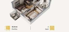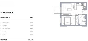 Stan u novogradnji površine 36.53m2 koji se sastoji od dnevnog boravka sa kuhinjom i trpezarijom, kupatla, spavaće sobe i terase.Zgrada je građena od termoblokova najviših izolacijskih svojstava+fasadna izolacija.Pregradni zidovi će biti izgrađeni od opeke. Tarket podne obloge u sobama i trpezariji a u kuhinji I kupatilu I klasa keramike i tuš paravan od kaljenog stakla, linijski slivnik i ugradni vodokotlić. Stan će imati sigurnosna vrata, optički priključak, interfon i instalacije za klimu. Rok završetka poslednji kvarta kvartal 2027.godine.