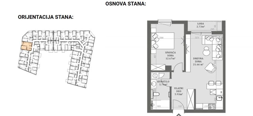 Stan u novogradnji površine 48.82m2 koji se sastoji od dnevnog boravka sa kuhinjom i trpezarijom, kupatla, spavaće sobe i terase.Zgrada je građena od termoblokova najviših izolacijskih svojstava+fasadna izolacija.Pregradni zidovi će biti izgrađeni od opeke. Tarket podne obloge u sobama i trpezariji a u kuhinji I kupatilu I klasa keramike i tuš paravan od kaljenog stakla, linijski slivnik i ugradni vodokotlić. Stan će imati sigurnosna vrata, optički priključak, interfon i instalacije za klimu. Rok završetka poslednji kvarta kvartal 2027.godine.