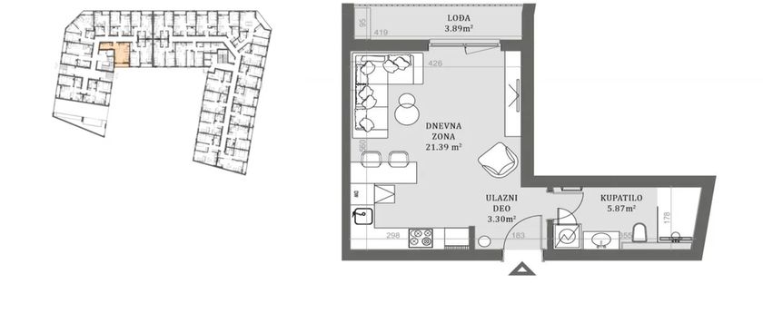 Stan u novogradnji površine 34.48m2 koji se sastoji od dnevnog boravka sa kuhinjom i trpezarijom, kupatila i terase.Zgrada je građena od termoblokova najviših izolacijskih svojstava+fasadna izolacija.Pregradni zidovi će biti izgrađeni od opeke. Tarket podne obloge u sobama i trpezariji a u kuhinji I kupatilu I klasa keramike i tuš paravan od kaljenog stakla, linijski slivnik i ugradni vodokotlić. Stan će imati sigurnosna vrata, optički priključak, interfon i instalacije za klimu. Rok završetka kraj 2027.godine.