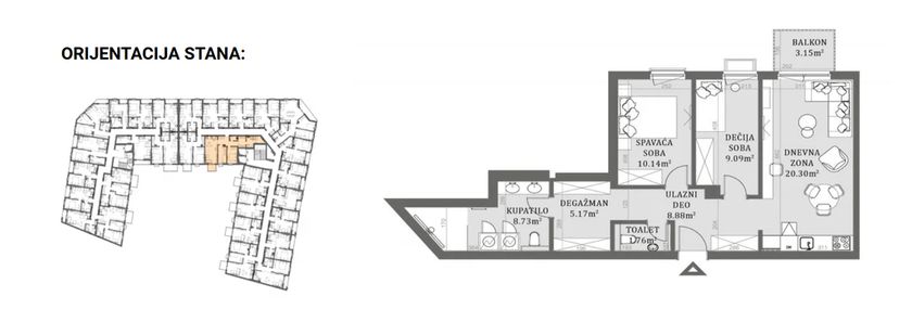 Stan u novogradnji površine 67,25m2 koji se sastoji od dnevnog boravka sa kuhinjom i trpezarijom, dve spavaće sobe,kupatila i toaleta. Stan će imati podno grejanje koje se ističe niskim troškovima grejanja na prirodni gas, kvalitetnu PVC stolariju sa troslojnim niskoemisionim staklom i PVC roletnom. Zidovi su izgrađeni od termoblokova najviših izolacijskih svojstava + fasadna izolacija.Pregradni zidovi izgrađeni su od opeke. Na podovima će biti tarket podne obloge u sobama i trpezariji, a keramika I klase u kupatilima i kuhinji. U kupatilu tuš paravani od kaljenog stakla i linijski slivnici i ugradni vodokotlići. Stan će imati sigurnosna ulazna vrata,optički priključak,interfon iinstalacije za klimu. Završetak radova kraj 2026. godine.