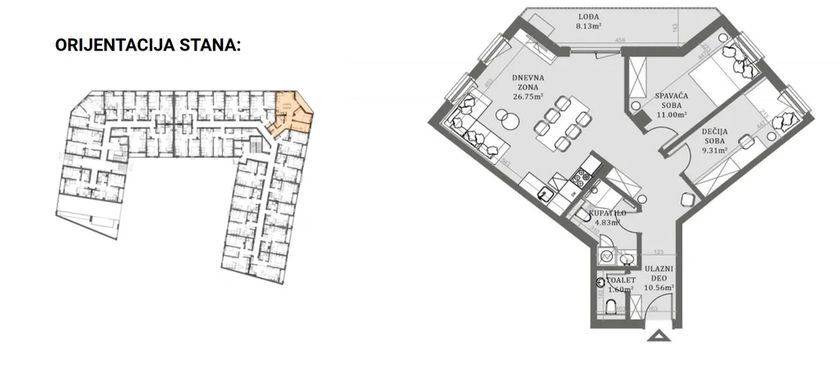 Stan u novogradnji površine 67,25m2 koji se sastoji od dnevnog boravka sa kuhinjom i trpezarijom, dve spavaće sobe,kupatila i toaleta. Stan će imati podno grejanje koje se ističe niskim troškovima grejanja na prirodni gas, kvalitetnu PVC stolariju sa troslojnim niskoemisionim staklom i PVC roletnom. Zidovi su izgrađeni od termoblokova najviših izolacijskih svojstava + fasadna izolacija.Pregradni zidovi izgrađeni su od opeke. Na podovima će biti tarket podne obloge u sobama i trpezariji, a keramika I klase u kupatilima i kuhinji. U kupatilu tuš paravani od kaljenog stakla i linijski slivnici i ugradni vodokotlići. Stan će imati sigurnosna ulazna vrata,optički priključak,interfon iinstalacije za klimu. Završetak radova kraj 2026. godine.