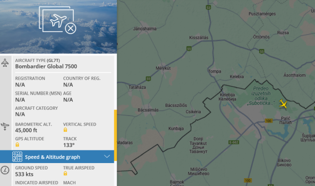 Ako je suditi po servisu za praćenje letova (flightradar24), u pitanju je "Bombardier Global 7500", avion poslovne klase sa ultra dugim dometom putovanja. Pola sata kasnije radar ga je locirao na izlasku iz Bugarske. Pri preletu iznad Subotice po ovom servisu zabeležena je brzina od 987 km/h (533 kts)!