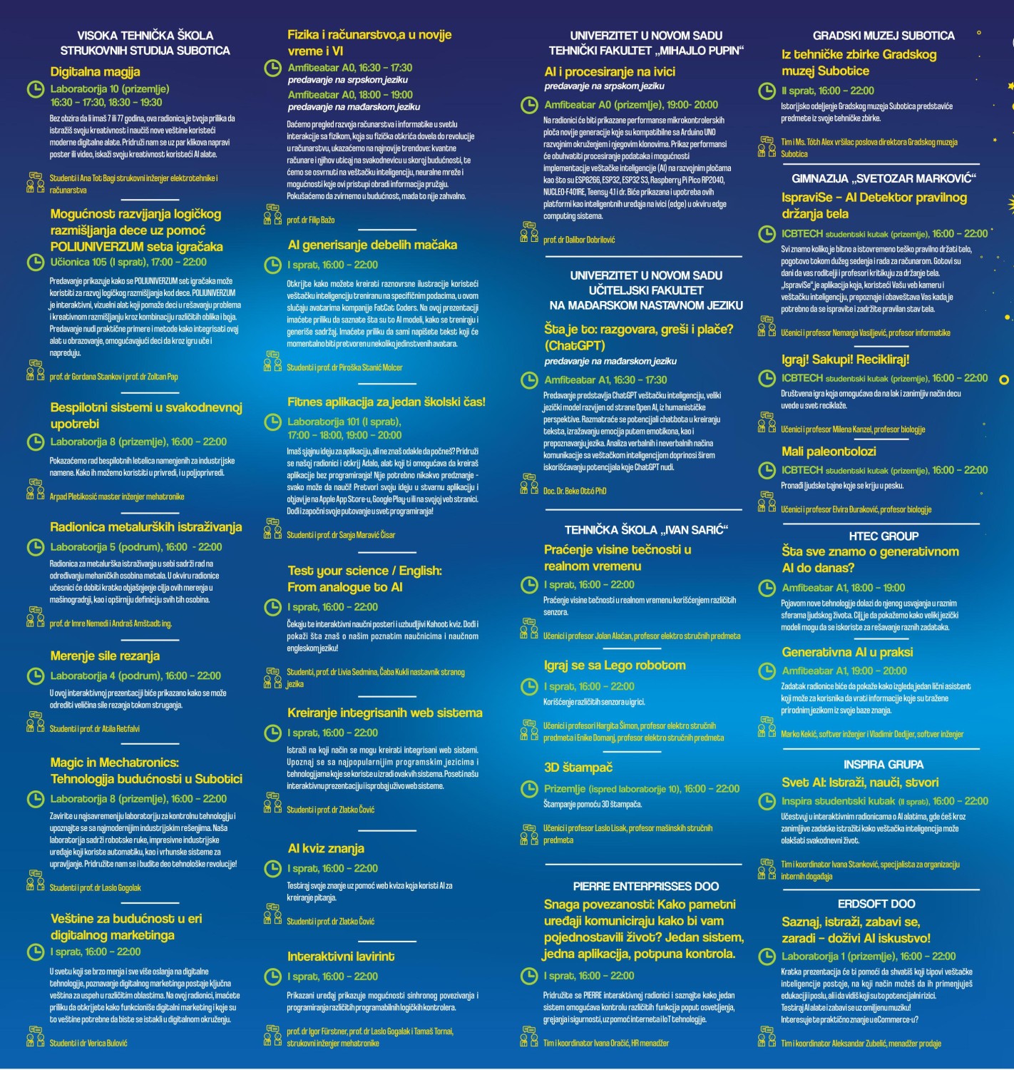 - Posetioci će imati mogućnost da poslušaju nekoliko zanimljivih predavanja koja će biti na srpskom ili mađarskom jeziku. I okviru tih predavanja moći će da saznaju neke osnove o veštačkoj inteligenciji, o modelima veštačke inteligencije, vrstama veštačke inteligencije, o generativnoj veštačkoj inteligenciji i, ono što je najvažnije, moći će da vide kako se implementiraju ti modeli u svakodnevnom životu, jer kao što znamo veštačka inteligencija utiče na sve sfere društva. Takođe, posetioci će imati mogućnost da se upoznaju i sa potencijanim rizicima prilikom upotrebe veštačke inteligencije - najavljuje prof. dr Zlatko Čović, pomoćnik direktora na Visokoj tehničkoj školi strukovnih studija - Osim predavanja, zainteresovani će biti u prilici da posete štandove na kojima će biti prezentovani projekti u kojima se već koristi veštačka inteligencija.