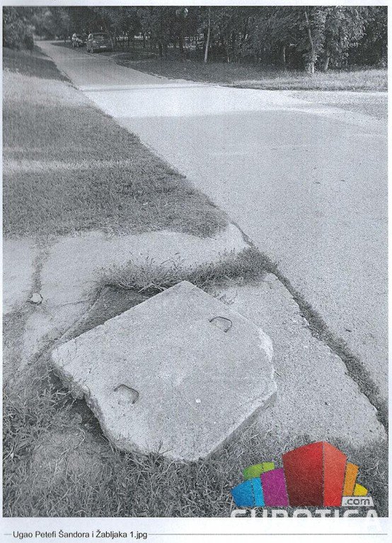 - na uglu Žabljaka i Petefi Šandora nedostajala je rešetka na otvorenom kanalu, čije održavanje nije u nadležnosti JKP “Vodovod i kanalizacija” Subotica, ali iz sigurnosnih razloga je ipakje prekriven betonskim poklopcem;
