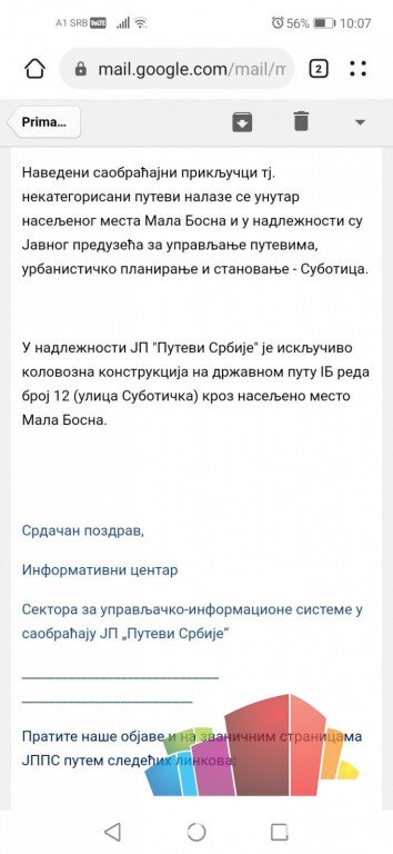 U prilogu šaljem odgovor puteva Srbije.
