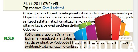 Vezano za navode iz Vaše pištaljke imamo obavezu da Vas obavestimo da je predmet sa pomenutom tematikom otvoren dana 21.11.2011. godine sa rokom rešavanja u trajanju od 3 dana. Pitanja vezana za putnu infrastrukturu i javne površine su u nadležnosti Direkcije za izgradnju Grada Subotica, te je stoga prvo njima bio upućen na postupanje. U toku današnjeg dana odgovorno lice JKP "Vodovod i kanalizacija" će dati odgovor na postavljeno pitanje, što će se uklapati u napred navedeni rok za davanje odgovora. U svakom slučaju, hvala na upozorenju! Drago nam je da smo u žiži interesovanja javnosti, a ovakav vid komunikacije i nakon toga rešavanje problema iz zahteva, doprineće poboljšanju kvaliteta života u našem gradu!