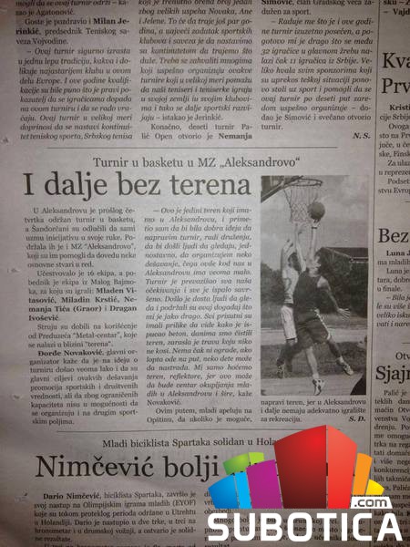 Bilo bi lepo kada bi se već jednom stavila tartan podloga na košarkaški teren "Bratstva" u Aleksandrovu.To je možda i jedino naselje u ovom gradu koje nema takav teren , a mnogi košarkaši , basketaši igrali su na tom terenu sve dok se nije pojavila tartan podloga i prešli na takve terene gde je postavljena tartan podloga.Teren je posećivalo sve manje ljudi , a zatim je neko uzeo i skinuo obe table. Zahvaljujući raznim molbama teren je od grada dobio 2 nove table i ljudi su polako počeli da dolaze.U početku je to bio mali broj omladinaca , sve dok vremenom to nije preraslo u ozbiljniju priču i počeo da se pojavljuje zavidan broj mladih i talentovanih igrača , starijih momaka , veterana a počeli su i da dolaze neki ljudi koji su pored terena pričali o početku cele ove priče koja je krenula još 1973. godine. Prošle godine preko leta grupica igrača sa ovog terena u ranim jutranjim časovima organizovali su se i okopavali teren kako bi došli do prvobitnih aut linija koje su se nalazile ispod korova.Oko 80% ljudi kažu da u životu svome nisu videli ove linije niti su znali za njih , isto tako izvukli su i nove linije koje takođe nisu pojačane još od formiranja ovog terena.Posle tih radnih akcija organizovan je i uspešni letnji turnir ( subotica.com/slike/album- … basketu-u-mz-aleksandrovo ) na kome je prisustvovalo čak 64 prijavljenih igrača ili ti 16 ekipa , slobodno mogu da kažem da je bilo isto toliko i gledalaca.Sve je to bila organizacija momaka sa ovog terena bez ikakve pomoći grada , tek neke male pomoći MZ Aleksandrovo.Momci su čak i zamolili drvaru koja se nalazi pored terena da se omogući struja za ozvučenje , koja je to i omogućila.Svi koji su pročitali ovo znaju o čemu pričam , pogotovo košarkaši ovoga grada jer svi su oni prošli ovaj teren jer basket se igra neprestano još od kada je teren napravljen a vrhunac brojčanog stanja bio je tako negde od 2002 - 2007 , i svi oni znaju za beton koji drobi patike posle mesec - dva. Elem želeo da apelujem da stanovnici ovoga naselja traže samo tu tartan podlogu i garantuje se mnogo veći broj ljudi na ovom terenu.I naravno nisam ni malo skrenuo sa ove teme , već sam samo predstavio jedan od problema što se tiče sporta u ovom gradu , naravno ima ih još u svim ostalim krajevima , u ovom gradu ima mnogo talentovanih sportista , zato molim grad da se pokrene još malo jače. Pozdrav svim sugrađanima !!! :)Povezana vest