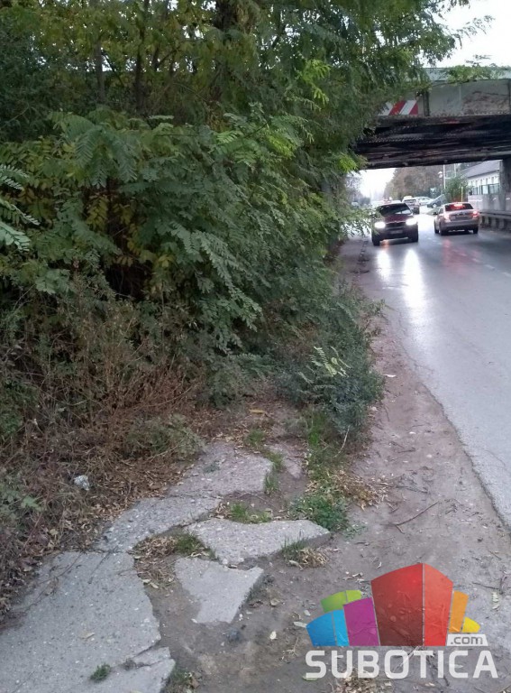 Deo trotoara od podvožnjaka prema Pioniru (desna strana) nije prohodan, zbog izraslog žbunja. Pešaci moraju sići na kolovoz da bi prošli tuda.