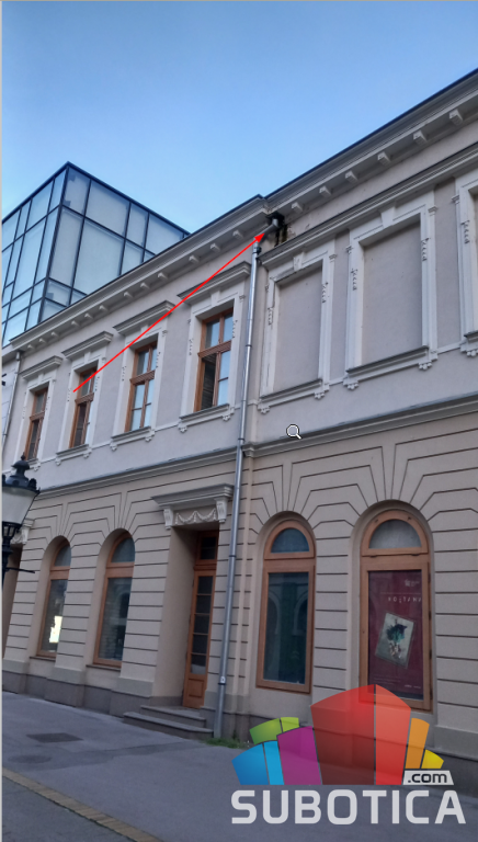 Na novom pozorištu propušta oluk i oštećuje fasadu, verovatno i krovnu konstrukciju. Treba sanirati da se ne bi širilo.