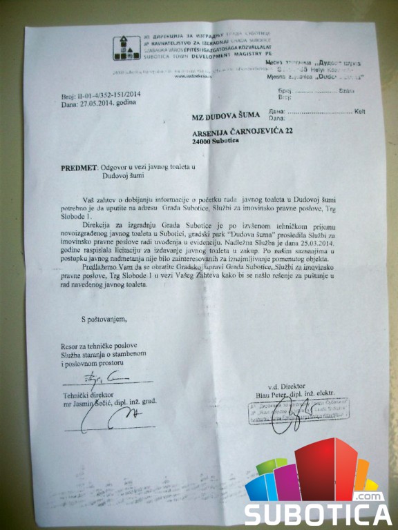 Krajem marta 2012.g. započeta je izgradnja trim staze i javnog toaleta u omiljenoj nam oazi mira i rekreacije zvanoj Dudova šuma. I dok je tartan podloga na opšte zadovoljstvo šetača, trčkarala, pa i ponekog bicikliste već tri godine u upotrebi isto se, nažalost, ne može reći za jedini toalet u okviru ove gradske destinacije. I pored n-tog broja pištaljki na tu temu, ipak bih par reči o najnovijem saznanju. Naime, shodno navodima u dopisu koji sam još 27.5.2014.g. dobio od lokalne Direkcije za izgradnju preko MZ "Dudova šuma", da: "...u postupku javnog nadmetanja nije bilo zainteresovanih za iznajmljivanje pomenutog objekta", odnosno "...obratite se Službi za imovinskom pravne poslove kako bi se našlo rešenje za puštanje u rad navedenog javnog toaleta", u svojstvu fizičkog lica 4.3.2015.g. sam se obratio naslovu i...? S obzirom na nedostajuća finansijska sredstva za plate zaposlenih i tekuće održavanje, otvaranje "euro modula" toaleta će uslediti uskoro, odnosno malo-sutra!? Pored dva-tri zatvorena slična objekta u Subotici, i čak 8 /osam/ u okviru palićkog kompleksa, ne očekuje li ista sudbina i "prinove" koje je koliko juče najavio aktuelni gradonačelnik g. Maglai? Ima se, može se. Da li?Povezane vesti